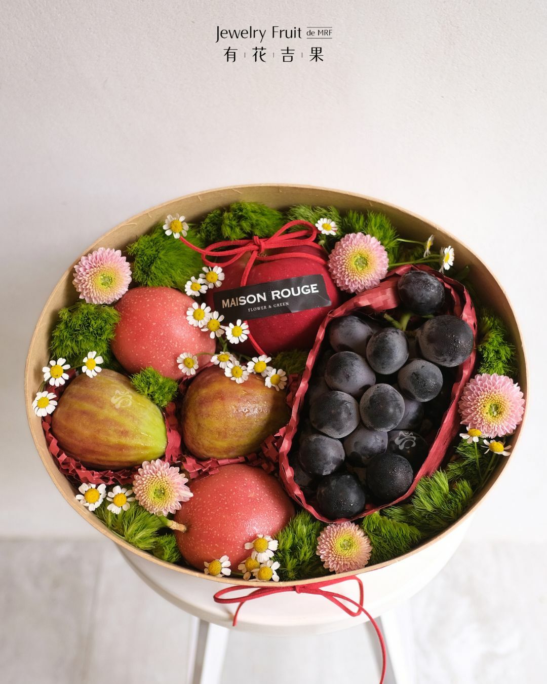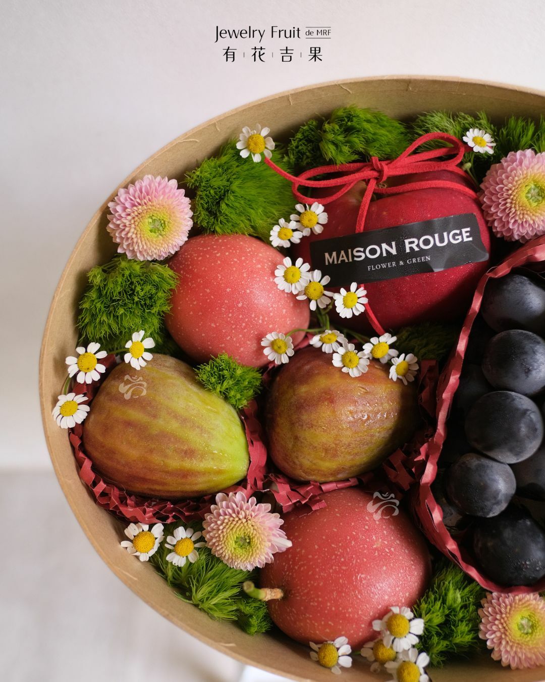 內容物:紐西蘭蘋果、巨峰葡萄、台灣產頂級無花果(若無法供應改以其他水果替代)、台灣產頂級百香果、裝飾性花材。