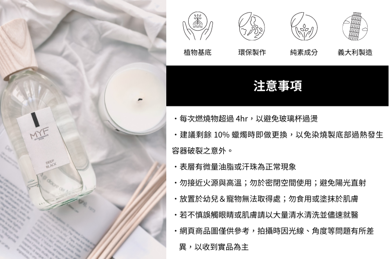 MYF來自時尚之都米蘭,秉持對生活與藝術之美的熱愛,融合義大利傳統工藝與經典文化,將所有傾注於時尚與香氛之作中。「Classica Scented Candle經典蠟燭系列」以高質感植物蠟與礦物蠟製作而成,安全、低煙、溫定又具備擴香力,瓶身簡約優雅,標籤採面料製成並手工粘貼,為產品增添一絲工藝氣息。