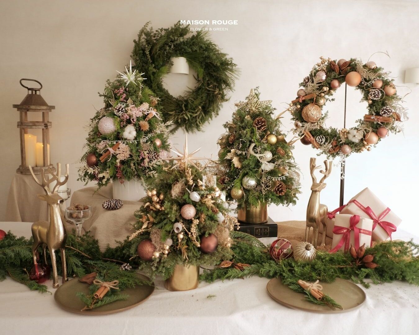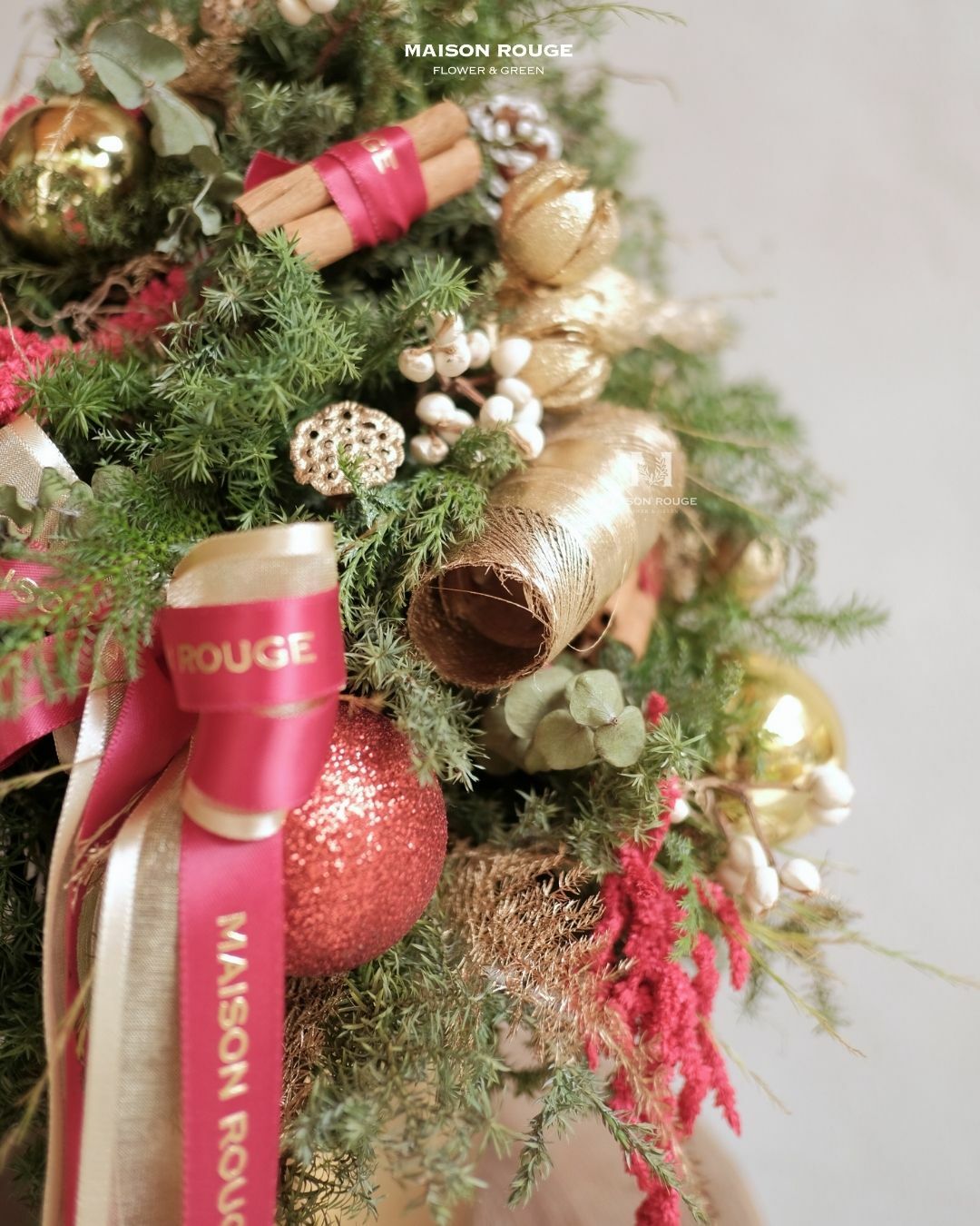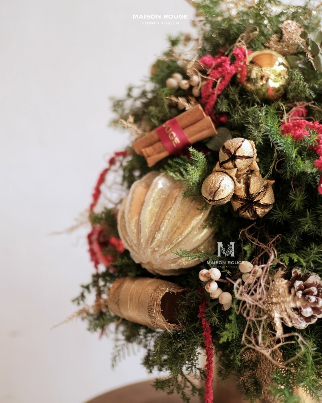 花材:雪松、絲柏、扁柏、肉桂、刷白松果、金色紫葳果等。