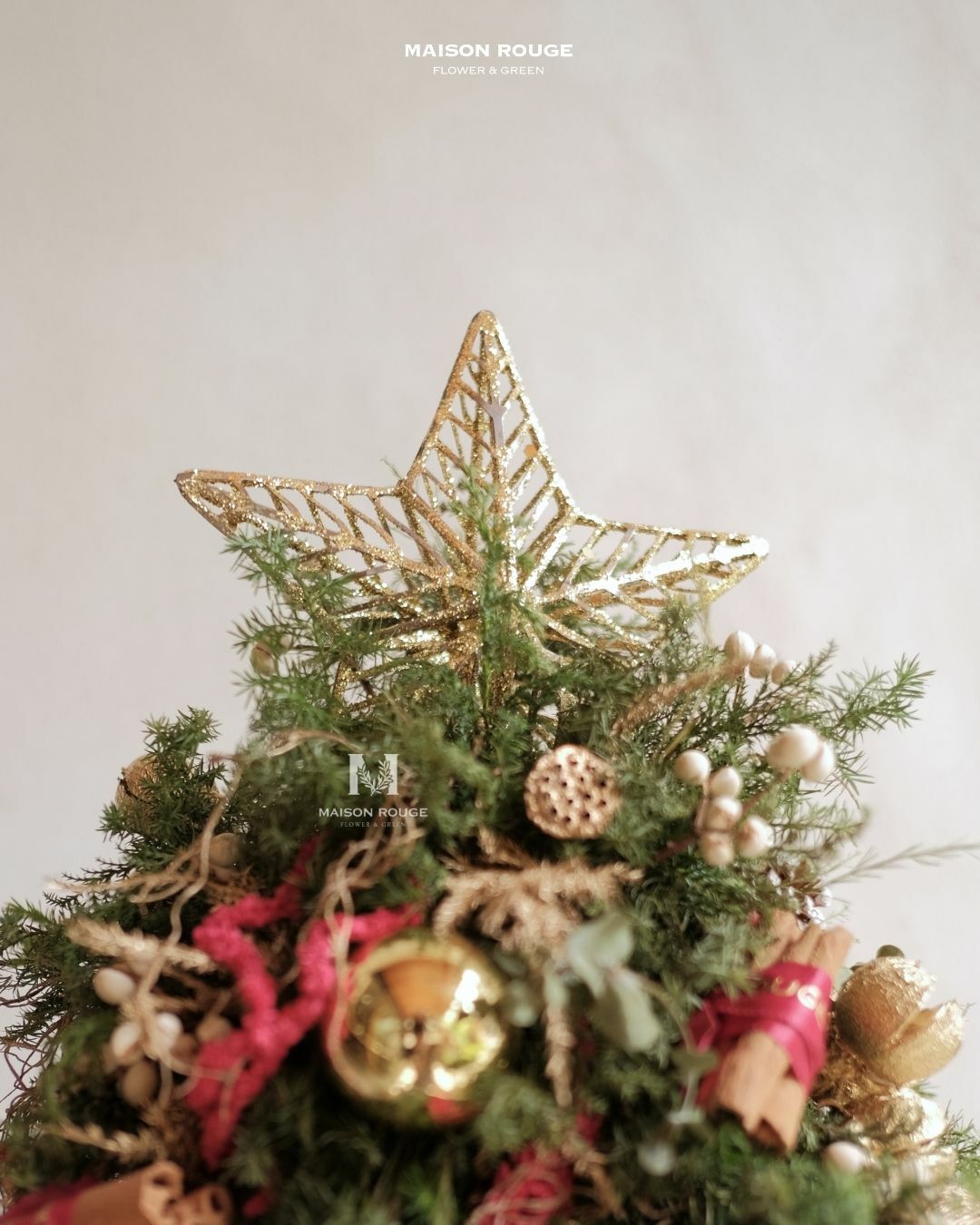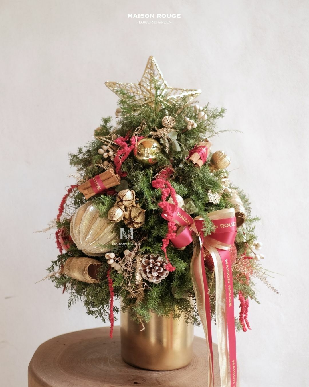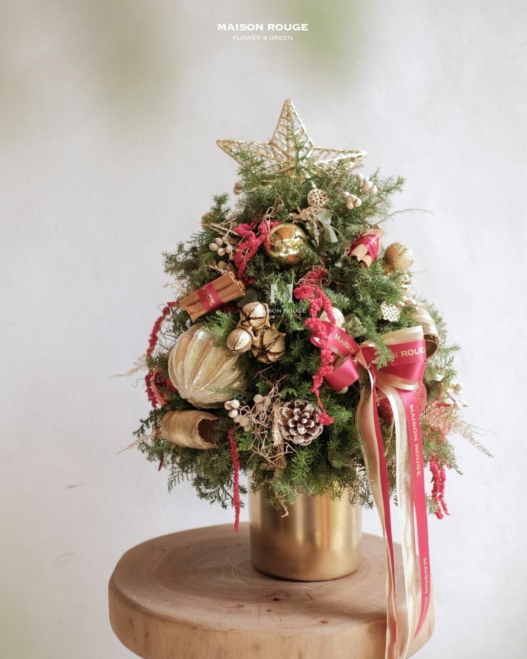 花材:雪松、絲柏、扁柏、肉桂、刷白松果、金色紫葳果等。