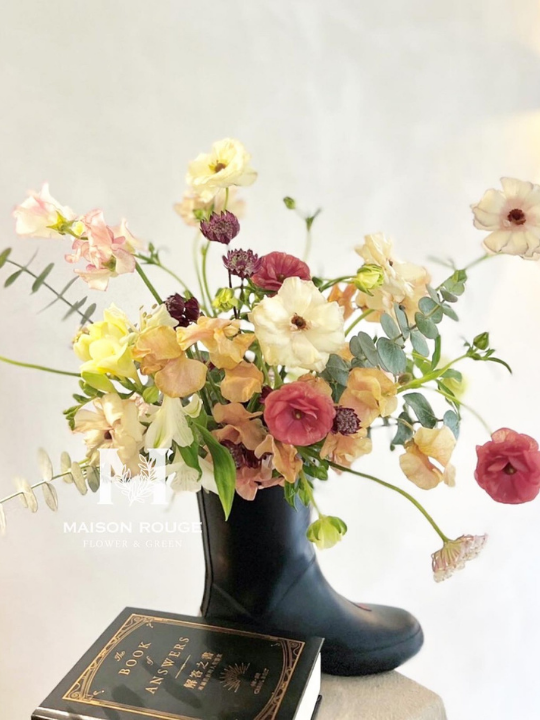 此課程請自備短靴(花器),插花時並不會用髒您的鞋子請放心,低筒鞋也可以,如有短/中筒靴子尤佳!