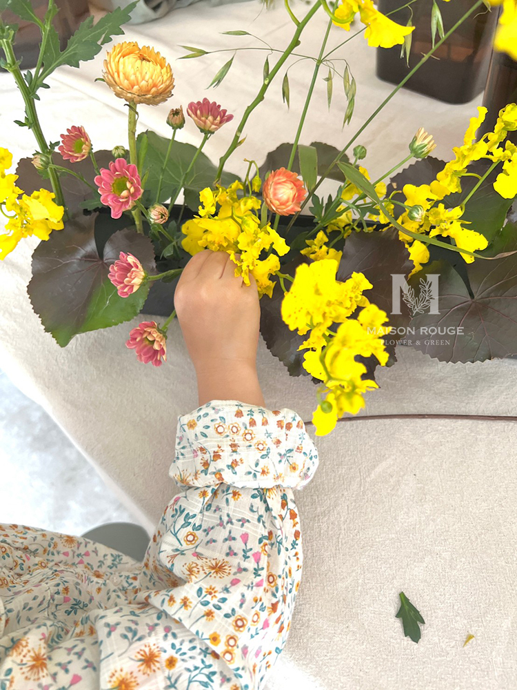 4. 使用當季的花材,學習枝條處理, 花材群組分佈技巧,激發小寶貝的創作靈感